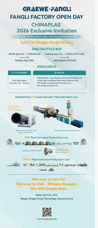 21 থেকে 24 এপ্রিল CHINAPLAS 2026-এ, বুথ 7.1C14-এ ফাংলি প্রযুক্তি দেখুন। আসুন একসাথে প্লাস্টিকের পাইপ সরঞ্জামগুলিতে উদ্ভাবন এবং ভবিষ্যতের সহযোগিতা অন্বেষণ করি!